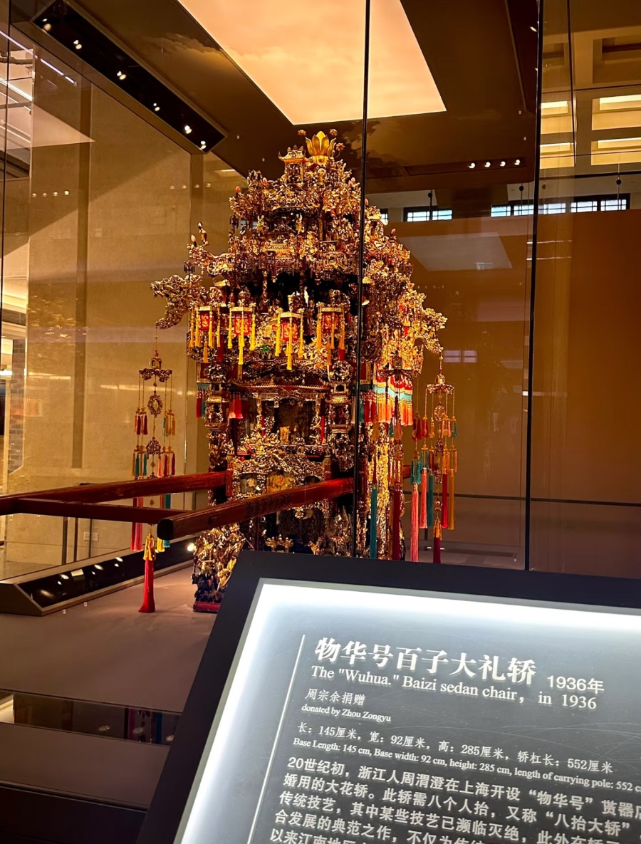 站在这顶物华号百子大礼轿前,目光被层层叠叠的金漆木雕牢牢锁住。1936年的时光,仿佛被凝固在这繁复的工艺里,每一处镂空、每一片鎏金,都在诉说着江南婚俗的隆重与精致。它需要八人合力抬起,轿身高达两米八五,红漆轿杠横贯左右,垂落的彩穗随风轻晃,仿佛还能听见当年迎亲队伍里的鼓乐喧天。金漆木作间,藏着早已濒临失传的传统技艺,亭台楼阁、人物花鸟栩栩如生,将“百子”的吉祥寓意铺陈得淋漓尽致这不仅是一顶花轿,更是一段被珍藏的市井烟火。周渭澄在上海开设的“物华号”,用这顶花轿见证了无数江南儿女的姻缘,如今它静静伫立在展柜中,褪去了迎亲时的喧嚣,却依旧在灯光下熠熠生辉,向我们诉说着旧时光里的浪漫与匠心